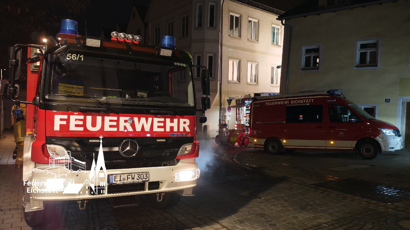 Die Drehleiter ging vor dem Gebäude in Bereitschaft. Über das HLF wurde die Wasserversorgung aufgebaut und die Einsatzstelle ausgeleuchtet. Der Gerätewagen Logistik transportierte mit Rauch und Ruß in Kontakt geratene Einsatzkleidung und Ausrüstungsgegenstände von der Einsatzstelle ab.